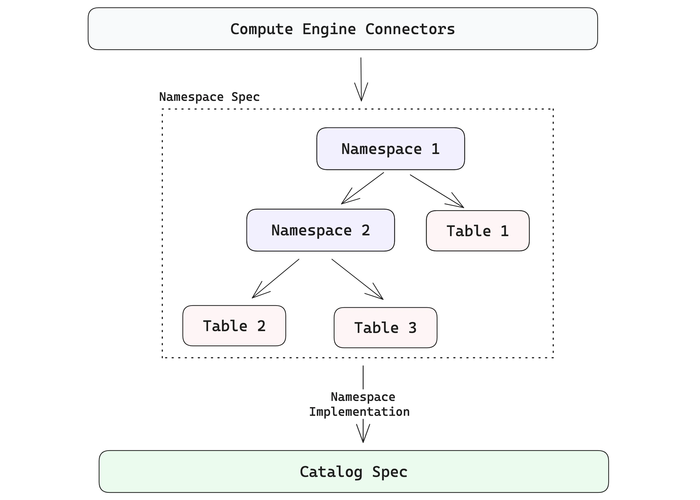 Namespaces are generalizations of catalog specs that give platform developers a clean way to present Lance tables in the structures users expect. The diagram below shows how the hierarchy can go beyond a single level. A namespace can contain a collection of tables, and it can also contain namespaces recursively.
